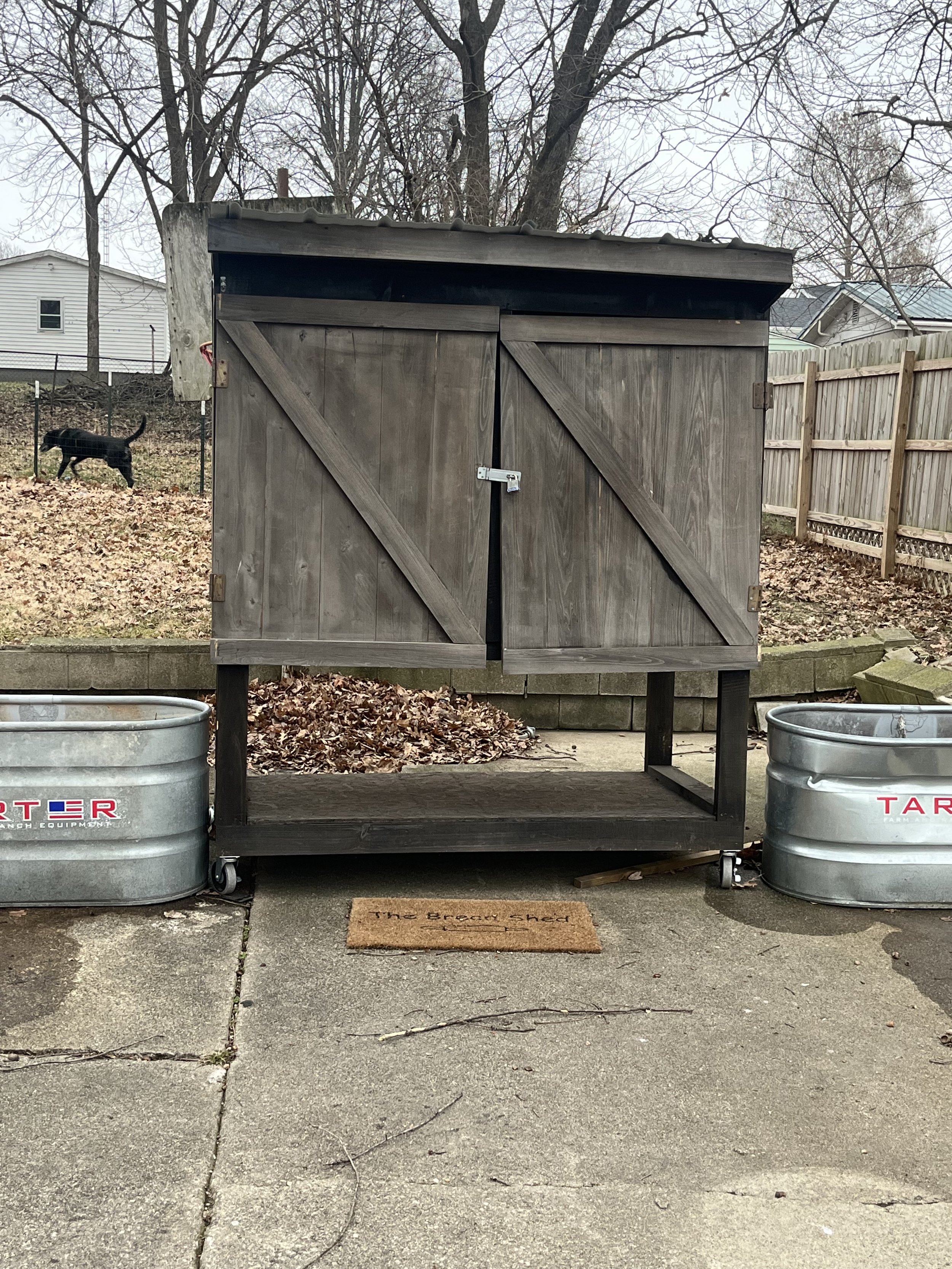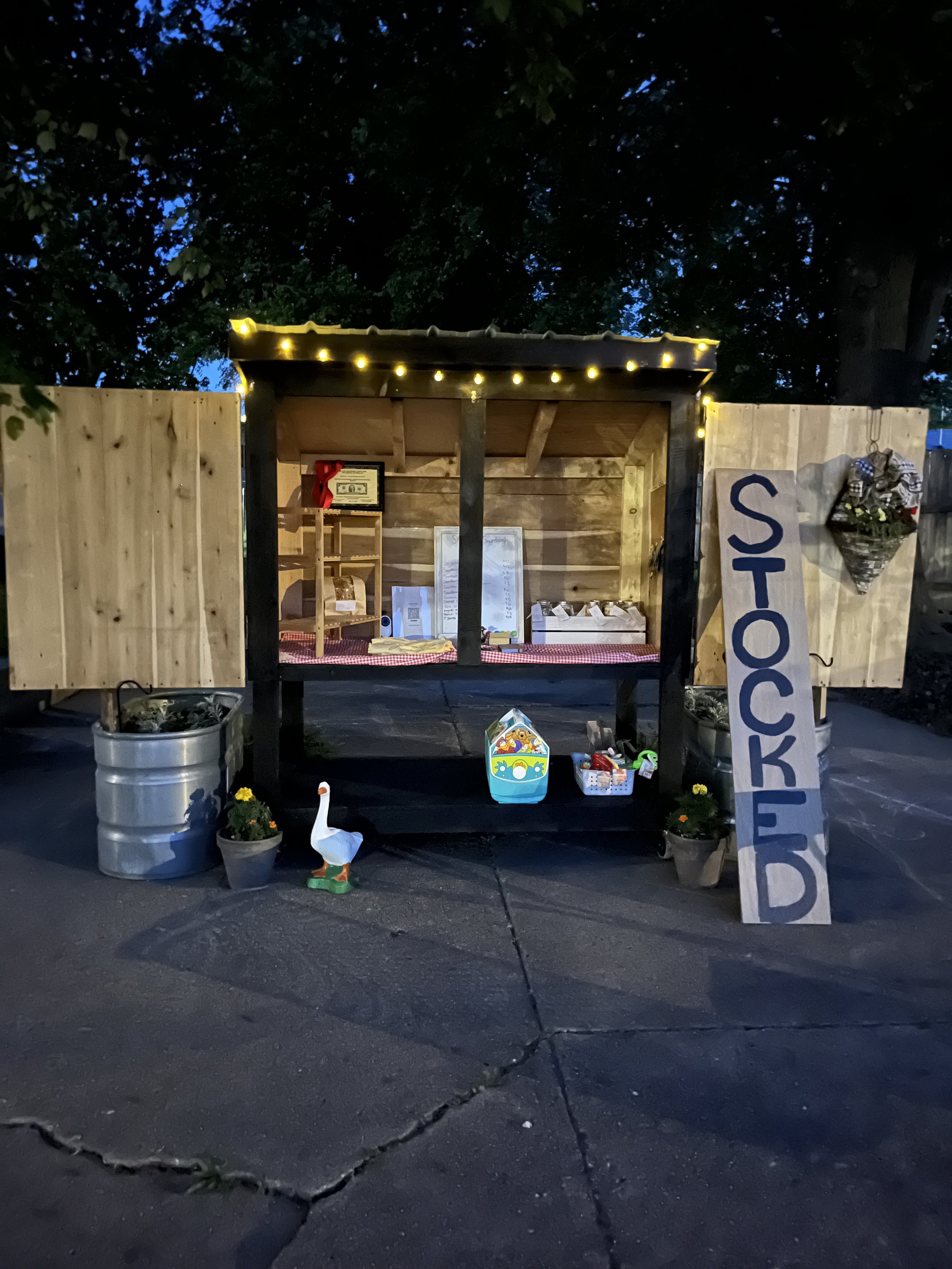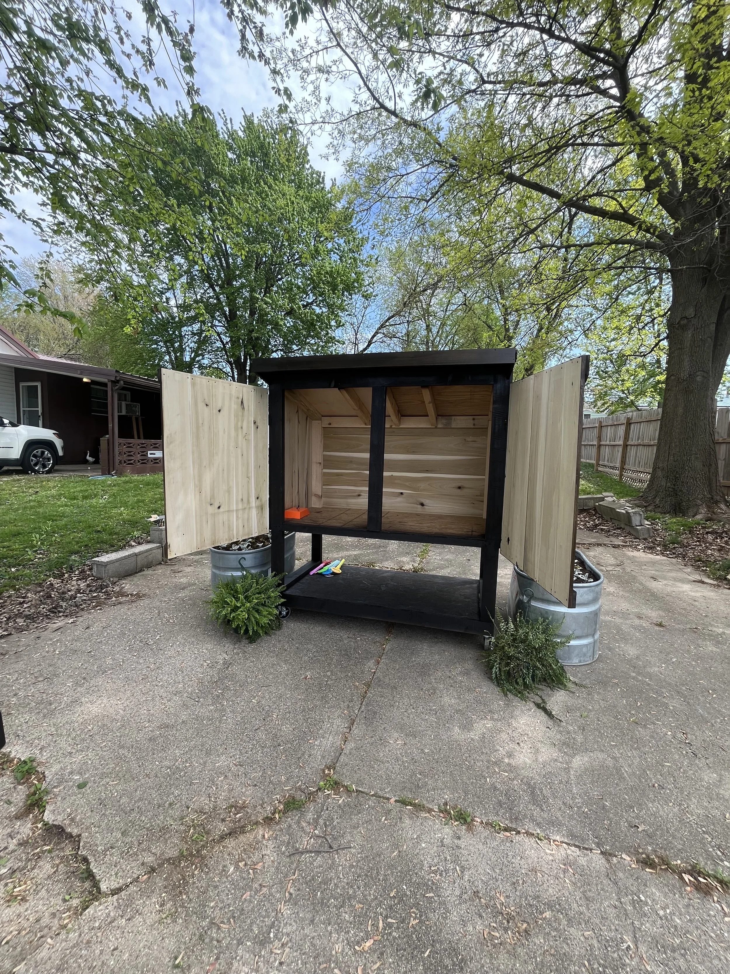 Description: Farm stand built in early 2025! Solid wood and pretty heavy. One door needs reattached at the hinges and the back wheels fell off in a storm but they come with it to be reattached. Pickup required. $200 OBO